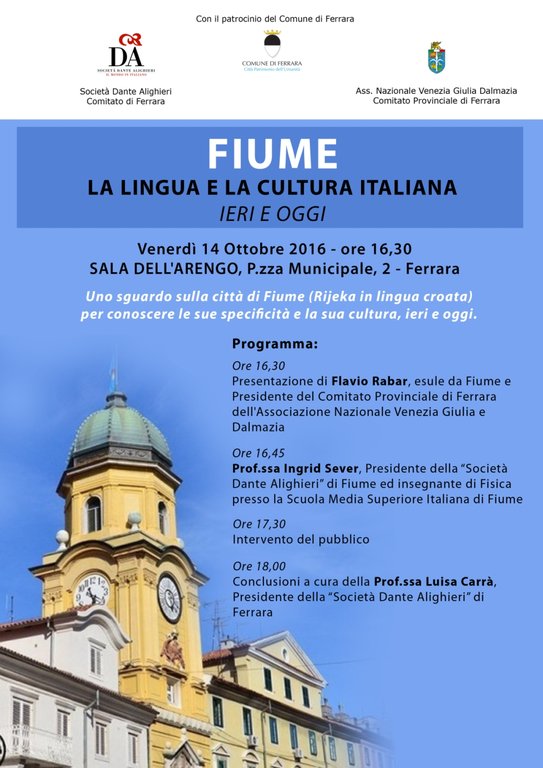L'incontro offrirà "uno sguardo sulla città di Fiume (Rijeka in lingua croata) per conoscere le sue specificità e la sua cultura, ieri e oggi" l L'appuntamento dal titolo "Fiume. La lingua e la cultura italiana, ieri e oggi", è organizzato dall'Associazione nazionale Venezia Giulia e Dalmazia - Comitato Provinciale di Ferrara presieduto da Flavio Rabar, in collaborazione con la Società Dante Alighieri e con il patrocinio del Comune di Ferrara.