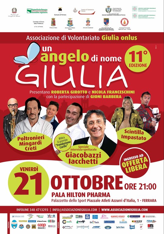 Divertimento e solidarietà: sono questi gli ingredienti base dello spettacolo 'Un angelo di nome Giulia' che venerdì 21 ottobre alle 21 animerà il Palazzetto dello sport di Ferrara (piazzale Atleti Azzurri d'Italia, 1) per raccogliere fondi a sostegno dei progetti di psico-oncologia, oncologia pediatrica e musico terapia promossi dall'associazione di volontariato Giulia onlus.