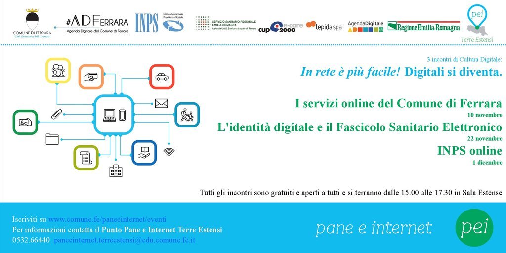 Il "Punto Pane e Internet Terre Estensi" organizza un ciclo di tre incontri di Cultura Digitale sui servizi online di pubblica utilità per il cittadino. Questa iniziativa è un'azione dell'Agenda Digitale del Comune di Ferrara ed è organizzata dal Punto Pane e Internet Terre Estensi dei Comuni di Ferrara, Masi Torello e Voghiera grazie alla collaborazione di Comune di Ferrara, Lepida spa, AUSL Ferrara, Cup2000, INPS. Gli incontri sono gratuiti, aperti a tutti - con traduttore Lis (lingua dei segni) - e si svolgeranno alla Sala Estense in Piazza del Municipio a Ferrara. E' gradita l'adesione iscrivendosi su:www.comune.fe.it/paneeinternet/eventi