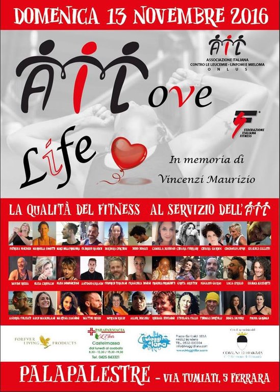 Un'intera giornata di fitness in compagnia di oltre trenta maestri di varie discipline per sostenere le attività dell'Ail (Associazione italiana contro le leucemie, linfomi e mieloma onlus). L'appuntamento è per domenica 13 novembre dalle 10 alle 19 al Palapalestre di Ferrara (via Tumiati, 5) per 'AILoveLife - Io amo la vita - Sostengo la ricerca e gli ammalati praticando sport', evento organizzato dalla sezione cittadina dell'Ail con il patrocinio del Comune di Ferrara.