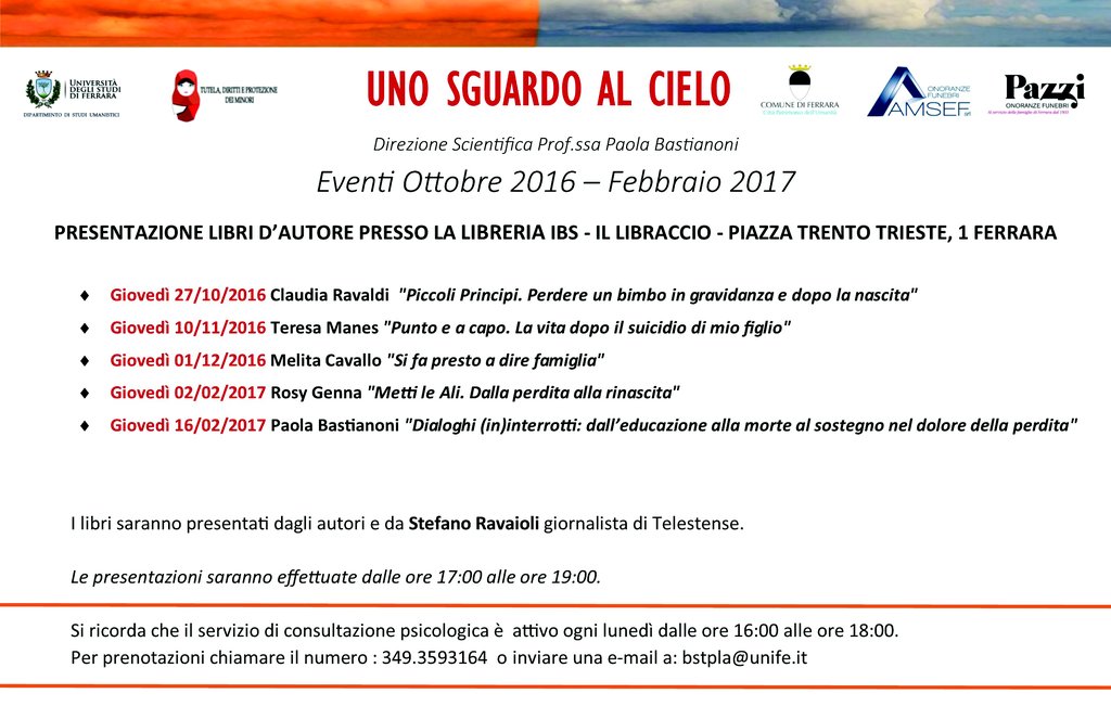 Tutti gli eventi in programma si inseriscono all’interno del progetto culturale “Uno sguardo al cielo” diretto dalla prof.ssa Paola Bastianoni, docente di psicologia dinamica dell’Università di Ferrara. Il progetto è realizzato in collaborazione fra Università di Ferrara, Master “Tutela, diritti e protezione dei minori”, Comune di Ferrara, AMSEF Srl., Pazzi onoranze funebri.