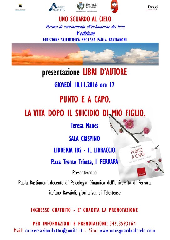 - In data 10.11 dalle 17 alle 19 alla libreria IBS - Libraccio (Piazza Trento Trieste 1 - Ferrara) ci sarà la presentazione del volume "Punto a capo. La vita dopo il suicidio di mio figlio" di Teresa Manes, che ci offrirà la sua testimonianza di sopravvissuta al suicidio del figlio.