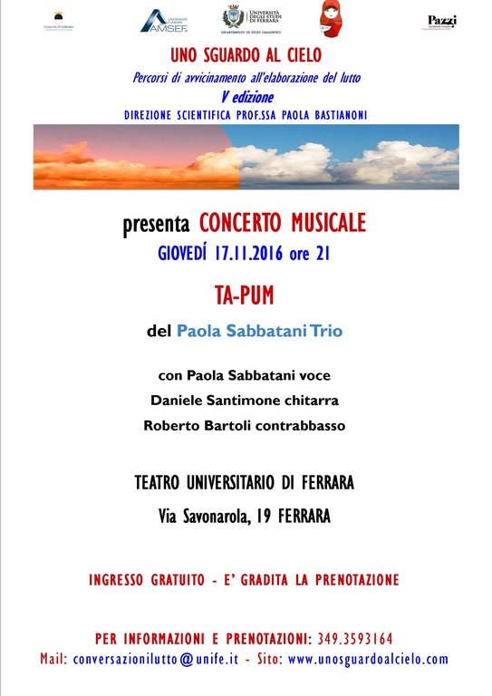- In data 17.11 alle ore 21 al Centro Teatro Universitario (CTU, Via Savonarola 19) avrà luogo il concerto musicale "Ta-pum" del Paola Sabbatani Trio con Paola Sabbatani voce, Daniele Santimone chitarra e Roberto Bartoli contrabbasso, si tratta di un racconto di canzoni italiane e di altri popoli che parlano della disumanità di ogni guerra, di lotta, di resistenza e di amore.