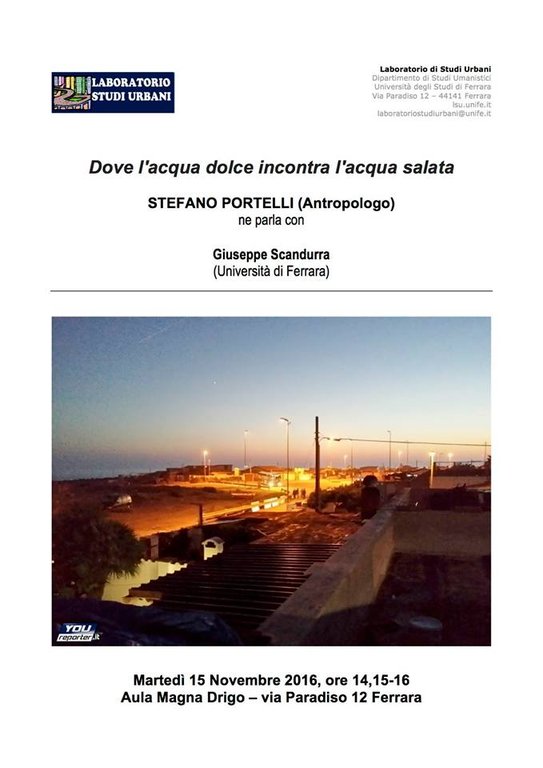 "Dove l'acqua dolce incontra l'acqua salata". Questo il titolo dell'incontro che, ripercorrendo le tappe di un percorso di ricerca in due quartieri della periferia di Roma - Nuova Ostia e Idroscalo - indurrà a riflettere sulle potenzialità dell'antropologia urbana come strumento per la comprensione della città, anche in rapporto alla pianificazione degli interventi urbanistici e sociali nelle zone urbane marginali.