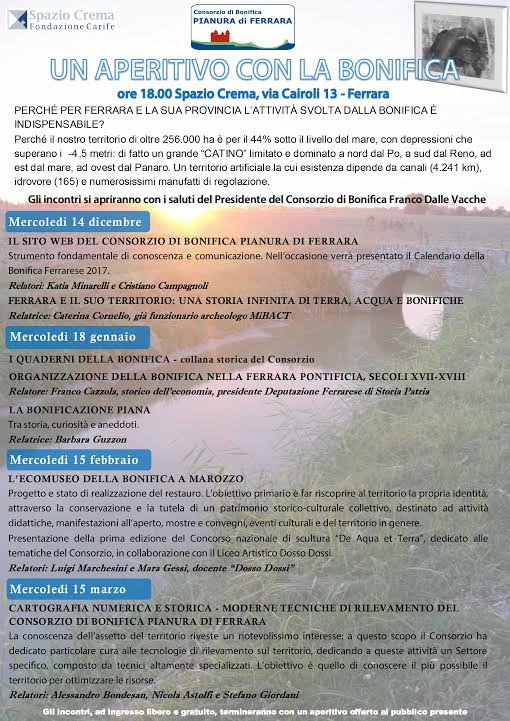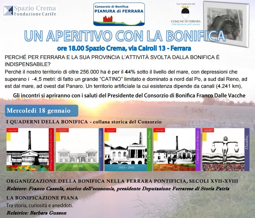 Mercoledì 15 febbraio alle ore 18,00, a Spazio Crema, via Cairoli 13, si svolgerà il terzo appuntamento di una serie di quattro incontri organizzati dal Consorzio di Bonifica Pianura di Ferrara, dal titolo: “L'Ecomuseo della bonifica a Marozzo”.