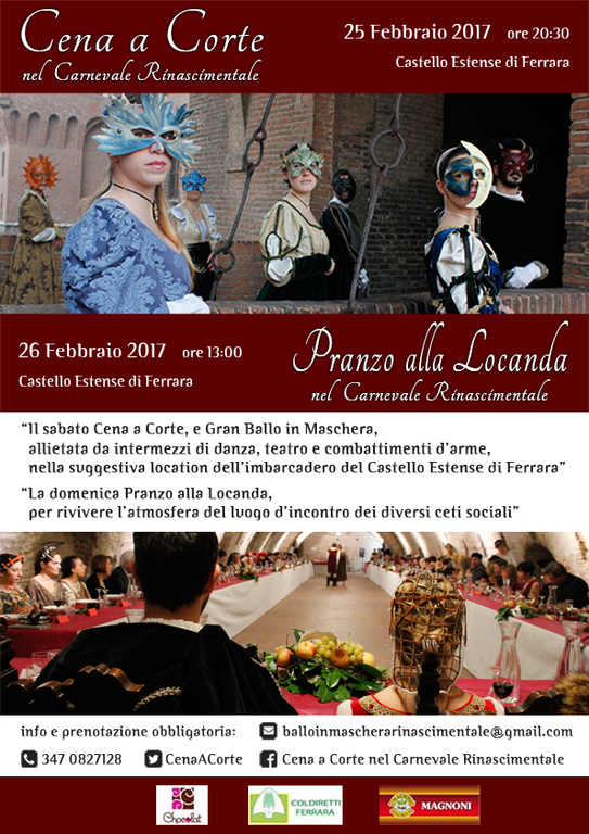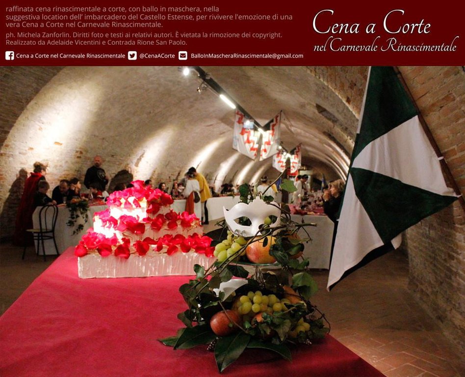 L'ambientazione nell'antica Ferrara della Corte Estense, getta un ponte ideale tra passato e presente. Si potrà così tornare al tempo della Corte Estense, con i suoi fasti, alla sua vita cortigiana e cavalleresca. La cena a corte si terrà il 25 Febbraio all'interno del carnevale rinascimentale, a cui si aggiunge anche il Gran Ballo che seguirà alla cena rinascimentale. La domenica 26 Febbraio si terrà il pranzo alla locanda dove si potrà assaporare l'atmosfera delle locande rinascimentali luogo d'incontro, di dame e cavalieri,contadini gente comune.