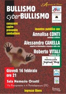 Giovedì 16 febbraio alle 21:00 nella sala Nemesio Orsatti a Pontelagoscuro (via Risorgimento 4), nell'ambito di "Appunti di Ponte" ciclo di incontri pubblici su vari temi organizzato dalla Pro Loco di Pontelagoscuro, si tiene la conferenza ad ingresso libero "Bullismo e cyberbullismo. Conoscere capire prevenire combattere". L'iniziativa è patrocinata dal Comune di Ferrara ed è a ingresso libero.