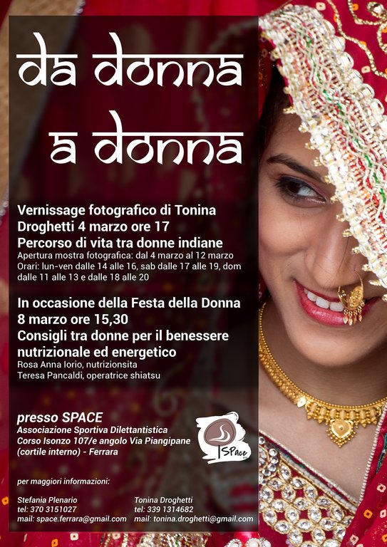 A partire da Sabato 4 marzo sarà aperta al pubblico la mostra fotografica curata da Tonina Droghetti, realizzata con suoi personali scatti che ritraggono momenti di vita di donne indiane, catturati durante un suo recente viaggio.