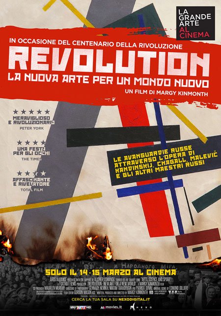 Martedì 14 e mercoledì 15, alle 21.00, per la serie “La Grande Arte al Cinema” in sala REVOLUTION – LA NUOVA ARTE PER UN MONDO NUOVO, un documentario racchiude il racconto di anni cruciali della storia russa e delle avanguardie artistiche che ne hanno cambiato per sempre il volto e lo fa con l’eleganza e la cura tipiche di Margy Kinmonth, pluripremiata autrice della BBC, già regista del documentario HERMITAGE, nominato ai BATFA. A 100 anni dalla Rivoluzione Russa del 1917, grazie all’accesso privilegiato a collezioni di importanti istituzioni russe, il docufilm narra le storie degli dell’avanguardia russa, come CHAGALL, KANDINSKIJ, MALEVIC e dei pionieri che con loro accolsero una sfida utopica e ambiziosa: quella di costruire una nuova arte per un nuovo mondo.