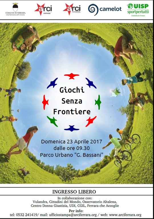 In occasione della 38° Edizione del Festival Vulandra, irrinunciabile appuntamento per aquilonisti provenienti da tutto il mondo, Arci Emilia Romagna e Arci Ferrara, in collaborazione con UISP e Camelot, invitano la cittadinanza e le diverse realtà presenti nel territorio ferrarese a partecipare e assistere alla prima edizione di “Giochi Senza Frontiere”che si svolgerà domenica 23 Aprile 2017, dalle 9.30 alle 13.30 al Parco Urbano “G. Bassani”.