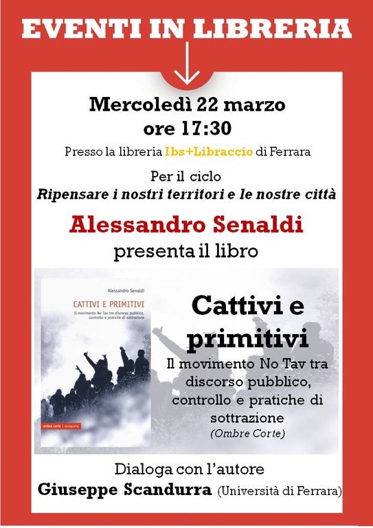 L'autore Alessandro Senaldi presenta il libro Cattivi e primitivi, il movimento No Tav tra discorso pubblico, controllo e pratiche di sottrazione. Il caso dei movimenti No Tav consentirà di discutere il modo in cui il conflitto attorno alla Val di Susa sia soprattutto un conflitto territoriale tra due differenti visioni dello spazio e dell'ambiente, e aiuterà a comprendere le ragioni degli uni e degli altri nonchè la posta in gioco. Dialoga con l'autore Giuseppe Scandurra docente dell'Università di Ferrara.