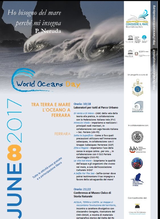 Giovedì 8 giugno 2017 si celebra in tutto il mondo la giornata mondiale dell'oceano: il World Ocean Day (vedi scheda allegata; WOD = http://www.worldoceansday.org/). In tutta Italia numerosi soggetti pubblici e privati organizzeranno attività di sensibilizzazione sul tema delle scienze marine e dell'oceanografia, per trasmettere i principi dell'Ocean Literacy (http://www.oceanliteracy.org/), letteralmente "alfabetizzazione all'oceano", la conoscenza dell'ambiente marino e l'importanza che esso ha per la vita del nostro pianeta.