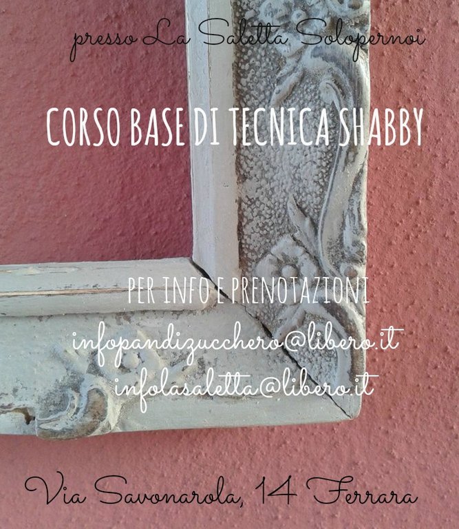 Il corso é tenuto da due docenti esperte in materia, si tratta di apprendere le tecniche base della decorazione in stile shabby su mobili di recupero, viene fornito il materiale necessario per la decorazione, una dispensa, un piccolo kit di strumenti di lavoro. La giornata di corso permette all utente di realizzare una decorazione completa su un proprio piccolo mobile.