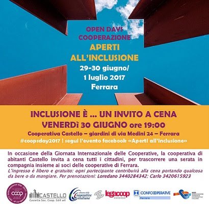 Inclusione è...in invito a cena! Venerdì 30 giugno in occasione della Giornata Internazionale delle Cooperative promossa da Legacoop, la Cooperativa Castello, di via Medini 24 Ferrara, con il suo Gruppo di Cittadinanza Attiva, vi invita a cena per passare una serata in compagnia dei soci delle Cooperative che durante la serata illustreranno i progetti e le iniziative curate.
