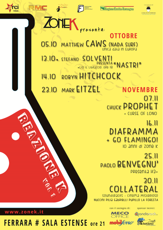 Giovedì 5 ottobre unica data europea di Matthew Caws, voce e chitarra della grande band power-pop newyorkese Nada Surf; sabato 14 ottobre il live di Robyn Hitchcock, leggendario cantautore e chitarrista inglese, già leader dei Soft Boys, in veste solista per presentare il suo nuovo e omonimo album all'insegna di una rinnovata vena psych-pop; lunedì 23 ottobre Mark Eitzel, frontman della storica band slowcore American Music Club, accompagnato dalla band per promuovere il suo nuovo bellissimo disco "Hey Mr. Ferryman" prodotto da Bernard Butler dei Suede; martedì 7 novembre in collaborazione con Roots Music Club il cantante e chitarrista statunitense Chuck Prophet, fondatore dei Green On Red, celebre per i suoi live infuocati, accompagnato dalla band per presentare l'ultimo lavoro "Bobby Fuller Died For Your Sins" e supportato dagli inglesi Curse Of Lono; giovedì 16 novembre la festa per i 10 anni di attività di Zone K con i Diaframma di Federico Fiumani e il supporto dei nostrani Go Flamingo! per una serata all'insegna della New Wave. Sabato 25 Novembre penultimo appuntamento con il concerto/spettacolo di Paolo Benvegnù, cantautore e chitarrista fondatore degli Scisma, che presenterà "H3+" accompagnato dalla band e per l'occasione dal burattinaio Luca Ronga; infine giovedì 30 novembre il ritorno della rassegna "Collateral" con lo spettacolo "Soundtracks - Cinema Misterioso" un viaggio nel cinema di tutte le epoche per riscoprire grandi capolavori sonorizzati dal vivo da quattro musicisti d'eccezione, Corrado Nuccini, Stefano Pilia, Enrico Gabrielli e Massimo Pupillo.