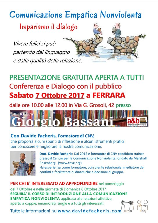 1) Sabato 7 ottobre presso la Biblioteca Bassani dalle ore 10 alle 12 il formatore Davide Facheris condurrà una presentazione della Comunicazione Non Violenta, così come ce l'ha ideata e praticata Marshall Rosenberg.