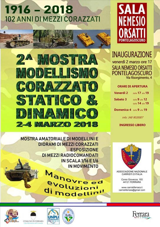 La Sala Nemesio Orsatti di Pontelagoscuro (via Risorgimento 4, Ferrara) ospiterà la 2.a Mostra di Modellismo corazzato statico e dinamico da venerdì 2 (ore 17) fino a domenica 4 marzo 2018.