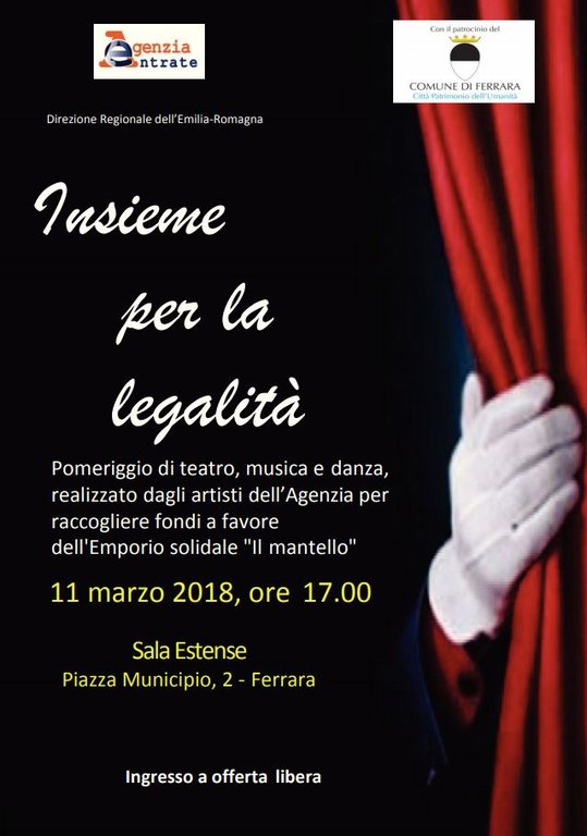 Domenica 11 marzo 2018 alle 17 nella sala Estense (piazza Municipio 14, Ferrara) è in programma "Insieme per la legalità", uno spettacolo di beneficenza organizzato dall'Agenzia delle Entrate Emilia-Romagna con il patrocinio del Comune di Ferrara. Una ventina di dipendenti dell'Agenzia si esibiranno in canti, musiche, rappresentazioni teatrali e danze, in forma corale o singolarmente.