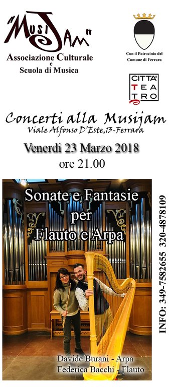 Venerdi 23 Marzo ore 21:00 presso la sede di viale Alfonso I d’Este,13 a Ferrara, ecco di novo i riflettori sull’Associazione Culturale di Promozione Sociale e Scuola di Musica Musijam Ferrara, con le sue ricche proposte musicali dalle mille sfumature. Dal Baluardo del Montagnone che si staglia sul territorio di San Giorgio con le sue vie, incroci, mura, percorsi immersi nel verde, partiranno le note dell’arpa del musicista di fama internazionale Davide Burani accompagnato dal flauto di Federica Bacchi, con l’ormai tradizionale concerto di inizio anno.
