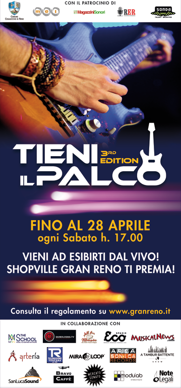 E’ partita la terza edizione di “Tieni il palco” con i primi sabati di “live”: quindici minuti per ciascun artista/band e una giuria di professionisti del settore a indicare le loro preferenze. La fortunata manifestazione musicale organizzata da Shopville Gran Reno, che si avvale del Patrocinio del Comune di Casalecchio (BO) e del MEI (Meeting delle etichette indipendenti) ha permesso in due anni ad oltre 650 musicisti di esibirsi dal vivo, “live”.