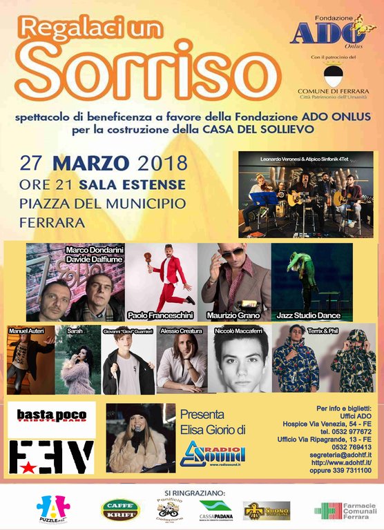 Vi aspettiamo alla sala Estense in Piazza del Municipio a Ferrara per una magnifica serata insieme. La serata è patrocinata dal Comune di Ferrara e si è potuta realizzare grazie al contributo degli artisti partecipanti e di BANCA CASSA PADANA ,KRIFI CAFFE', AFM, SUONO IMMAGINE, PUZZLE ART,STAMPA DIGITALE FERRARA, PANIFICIO DELLEPIANE che hanno sostenuto in modalità diverse l'iniziativa.