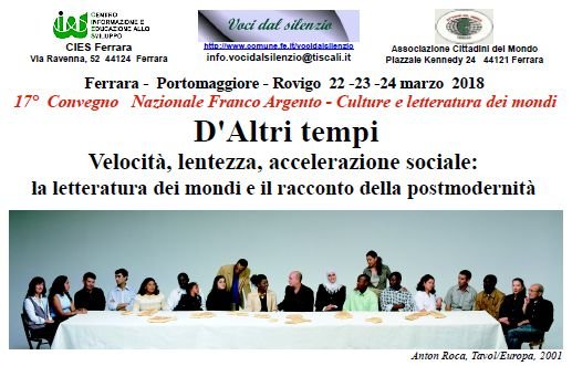 Con la 17a edizione del Convegno nazionale Franco Argento prosegue l'esplorazione della letteratura della migrazione che negli ultimi anni ha già coinvolto centinaia di studenti delle scuole ferraresi. In programma nelle mattinate del 22, 23 e 24 marzo prossimi tra Portomaggiore e Pontelagoscuro il convegno ha per titolo 'D'altri tempi. Velocità, lentezza, accelerazione sociale: la letteratura dei mondi e il racconto della postmodernità" ed è, come sempre, organizzato da Cies Ferrara e Associazione Cittadini del Mondo, con il patrocinio e il contributo del Comune di Ferrara, della Regione Emilia Romagna e del Comune di Portomaggiore.