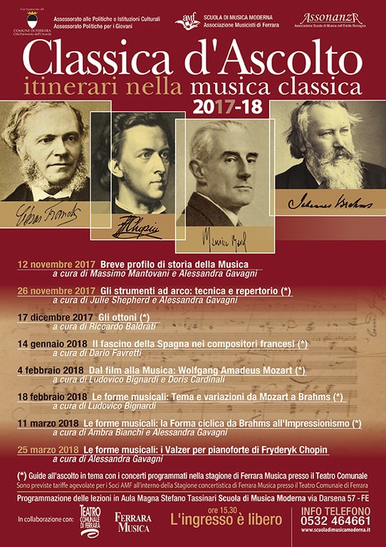 Conseguentemente, Domenica 25 marzo dalle ore 15:30 alle 18:00 comincerà, nell'aula magna della scuola stessa in via Darsena 57, l'ultimo spettacolo per la serie di incontri Classica d'Ascolto dal titolo "Le forme musicali: i Valzer per pianoforte di Fryderyck Chopin" a cura di Alessandra Gavagni.