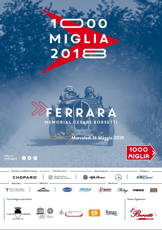 La Mille Miglia 2018 in programma dal 16 al 19 Maggio sul tradizionale percorso Brescia-Roma-Brescia, passa da Ferrara il 16 maggio