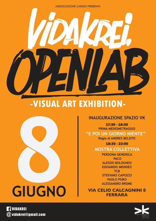 Il nuovo studio del collettivo di “creativi dell’arte urbana” VIDAKREI apre per la prima volta le sue porte al pubblico con una mostra che avrà luogo Venerdì 8 Giugno in via Calcagnini 8, Ferrara, a partire dalle ore 17.30 con la prima del mediometraggio di Andres Belsito intitolato “E poi un giorno niente”, per poi proseguire dalle 18.30 fino alle 21 con la mostra artistica degli altri membri del collettivo VIDAKREI: Persona Generica, Paco, Alessio “Bolo” Bolognesi, Edoardo Mendez, TCB, Stefano Capozzi, Paolo Psiko e Alessandro Brome
