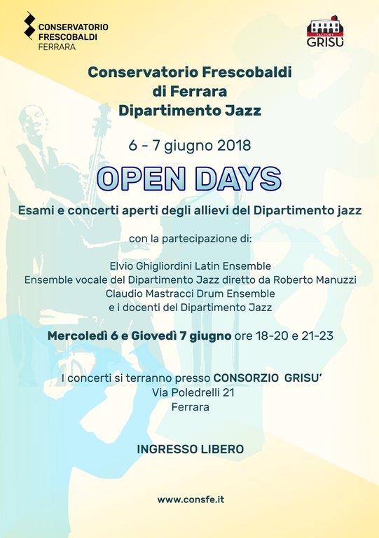 Mercoledì 6 e giovedì 7 giugno, per la prima volta alla Factory Grisù di Ferrara, arrivano gli Open Days, due giorni di concerti aperti alla collettività, per farsi accompagnare alla scoperta delle sonorità jazz e - allo stesso tempo - per conoscere i diversi percorsi di formazione jazzistica proposti dal Conservatorio Frescobaldi di Ferrara. Quest’anno, una grande novità: la collaborazione con il Consorzio Factory Grisù, il cui cortile interno diventerà un palcoscenico a cielo aperto per i concerti proposti dagli allievi e dai docenti del Dipartimento di Musica Jazz del Conservatorio Frescobaldi di Ferrara.
