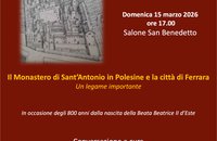 In occasione delle manifestazioni culturali promosse dal Monastero in occasione dell’VIII centenario della nascita della Beata Beatrice II d’Este, la conversazione a cura di Carla Di Francesco ripropone alla conoscenza della città un luogo che ha visto i recenti restauri, voluti dal Mondo Benedettino, dalla Regione Emilia-Romagna, dal Comune di Ferrara e dal Ministero della Cultura.